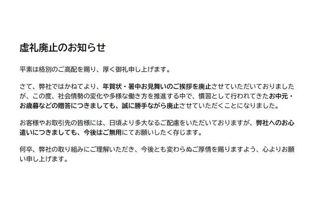 平素は格別のご高配を賜り、厚く御礼申し上げます。 さて、弊社ではかねてより、年賀状・暑中お見舞いのご挨拶を廃止させていただいておりましたが、この度、社会情勢の変化や多様な働き方を推進する中で、慣習として行われてきたお中元・お歳暮などの贈答につきましても、誠に勝手ながら廃止させていただくことになりました。 お客様やお取引先の皆様には、日頃より多大なるご配慮をいただいておりますが、弊社へのお心遣いにつきましても、今後はご無用にてお願いしたく存じます。 何卒、弊社の取り組みにご理解いただき、今後とも変わらぬご厚情を賜りますよう、心よりお願い申し上げます。